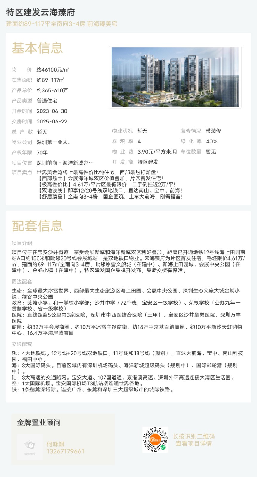 樓盤:特區(qū)建發(fā)云海臻府物業(yè)類型:普通住宅戶型:3室、4室面積:約89-117平米總價:約365-610萬聯(lián)系人:何詠斌聯(lián)系電話:13267179661